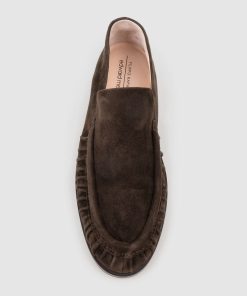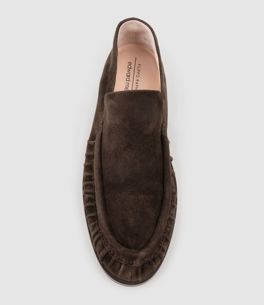The HAVEN loafers by Filippo Raphael for Edward Meller combine effortless style with exceptional comfort. Made from soft suede leather, they feature gently ruched detailing along the rounded toes for a touch of understated elegance. These versatile flats are set on a low heel for all-day wear. A cushioned insole and full leather lining ensure breathability and support, making them as practical as they are chic. Relaxed yet modern, the HAVEN loafers are a wardrobe essential.